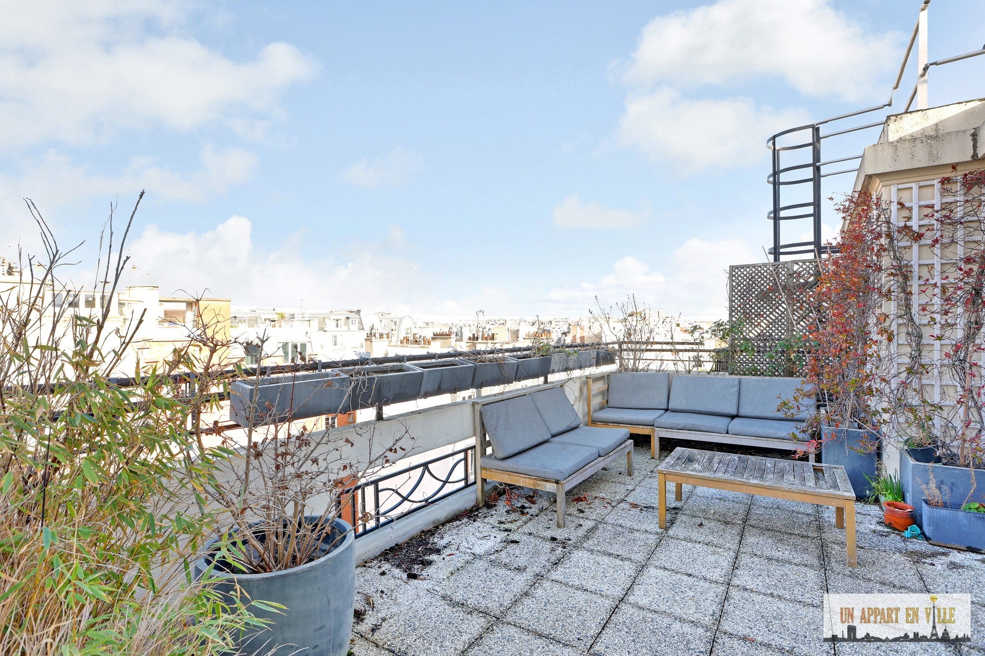 Rare: Au dernier étage d'un immeuble standing, appartement atypique baigné de lumière avec 2 terrasses accessibles par l'espace de vie et chambre, cuisine avec verrière, salle d'eau avec WC.