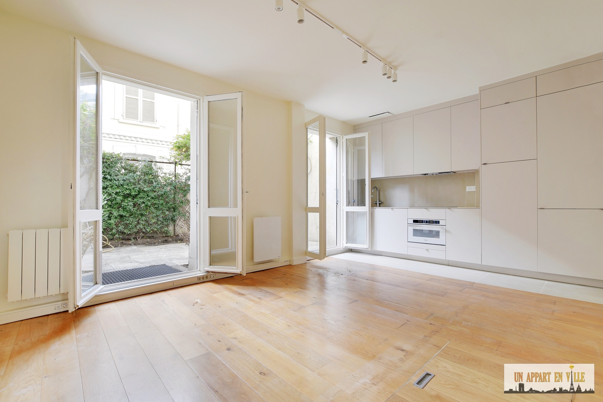 Au grand calme, appartement entièrement rénové, prestations de qualité, très lumineux, séjour avec cuisine (aménagée et équipée) ouverte sur jardin privatif, 2 chambres dont une en souplex avec 2 fenêtres anglaises, salle d'eau avec WC séparés.