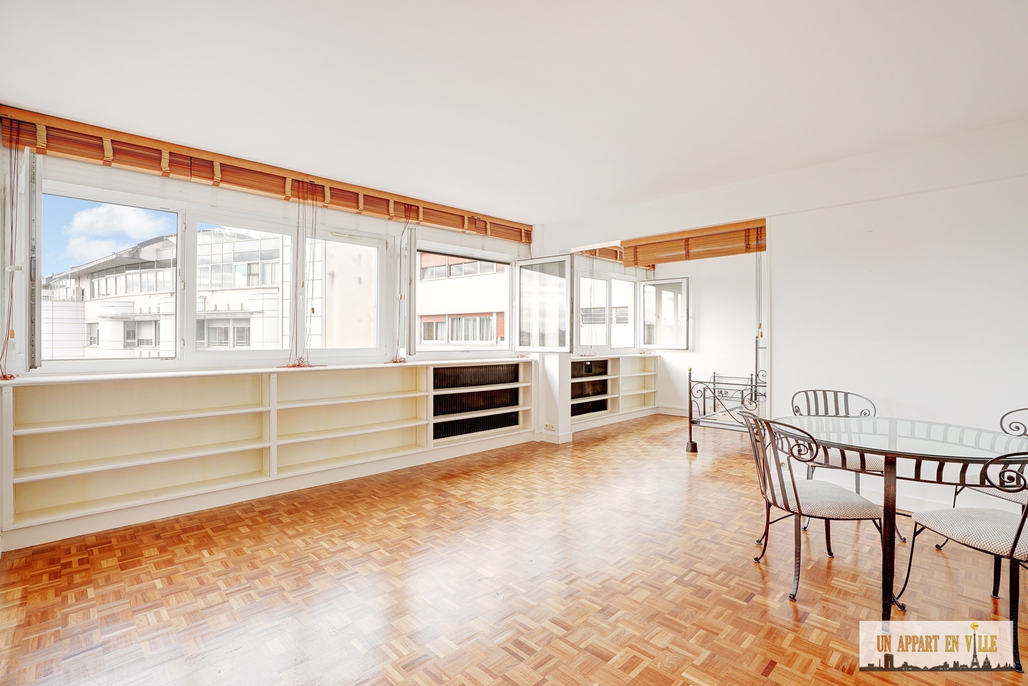 Avenue de Versailles - Dans immeuble 1970 - Appartement au 7ème étage sans vis à vis, vue dégagée sur Paris. Entrée, séjour avec grande baie vitrée exposition Sud-Est, 2 chambres, cuisine séparée avec office, une salle d'eau, une salle de bain, WC séparés. Chauffage et eau chaude collectifs . Gardienne